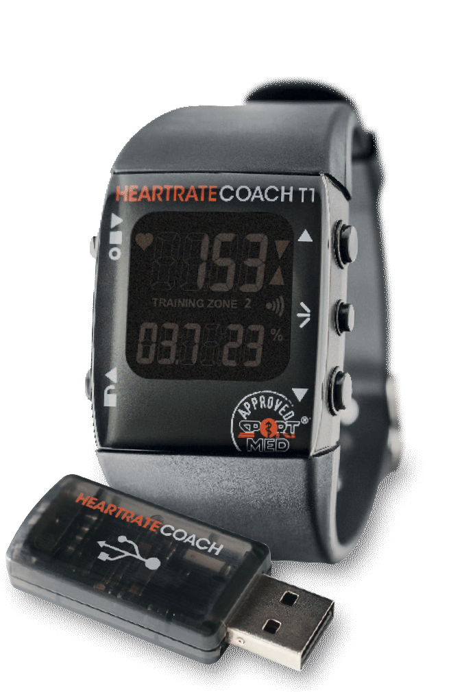 The HeartRateCoach T1 (or simply, the HRC T1) is a specific SportMed product that combines the functions of a heart rate monitor and data carrier and is fully tailored to your SportMed training. The unique BlueRobin wireless communication technology for digital data transfer allows it to communicate wirelessly with your computer (only compatible with Windows!) via the HRC-USB dongle (Interface). This makes the HRC a user-friendly heart rate monitor that does not bother you with complicated settings - these are loaded from the HRC Sync Home app (free) or by your SportMed Coach - before you can start training. Just synchronize and you are ready to train. You get a perfect overview of your training via the HRC Sync application and the SPOL app and you automatically inform your SportMed Coach about your efforts.